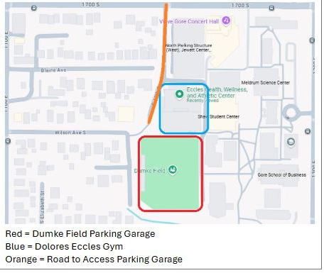- Parking: Parents will be able to park in the Parking Garage below Dumke Field (map linked)