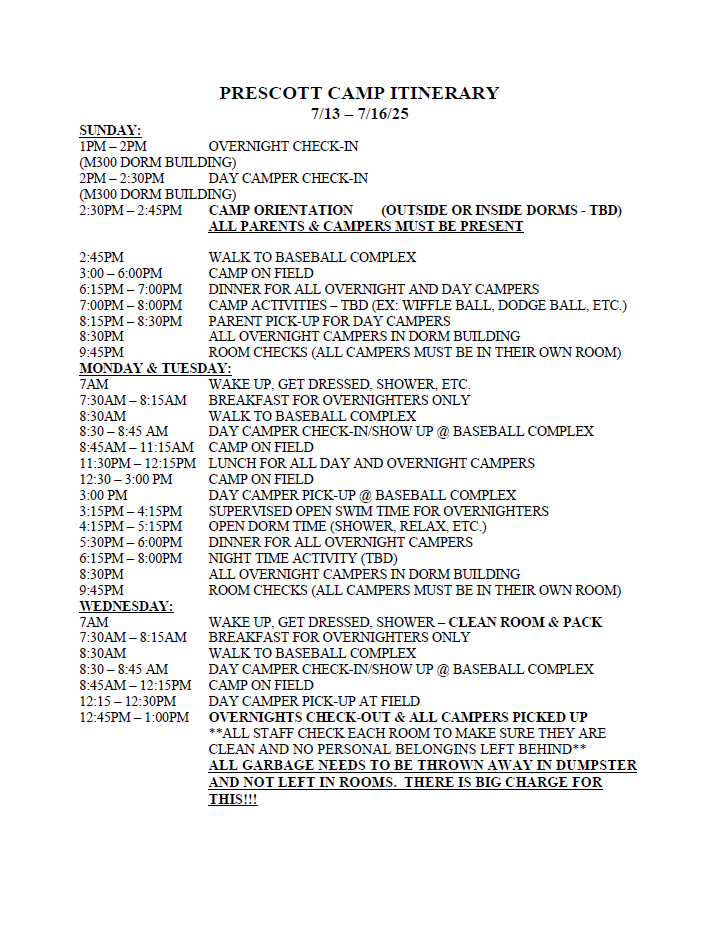- Click HERE for the FULL camp schedule.